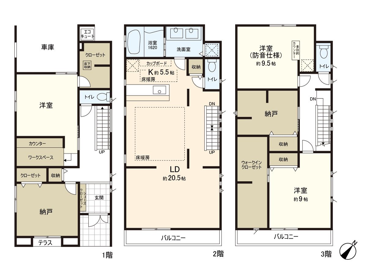 ○ 在9.5张塌塌米3楼的西式房间,有用隔音式样多目的柜台