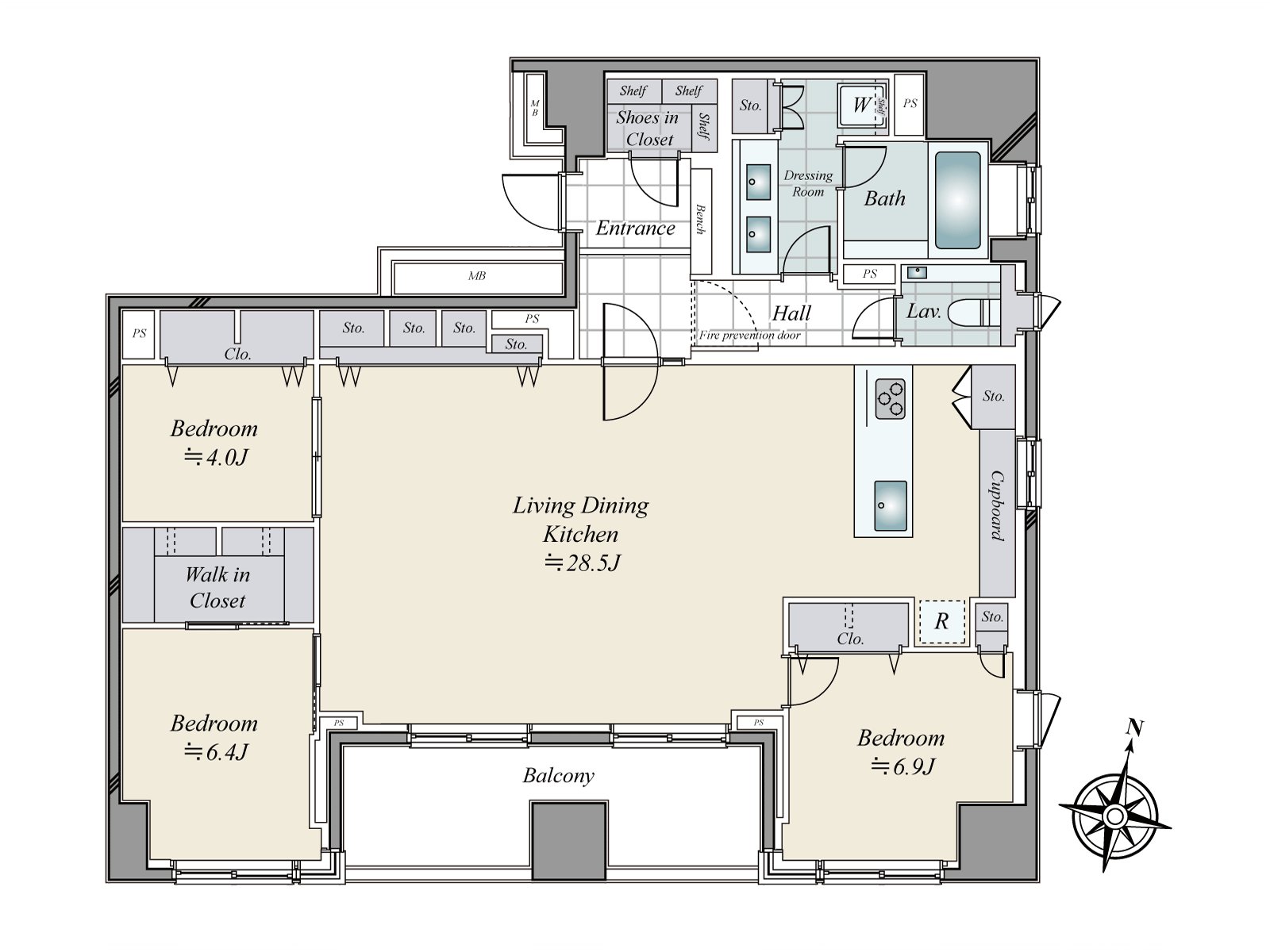 约28.5张塌塌米朝南的LDK。亮的自然光从大的窗插进去,开放性的空间伸展。餐厅正和厨房成为一体。(销售价格不包括家具、供给品。)