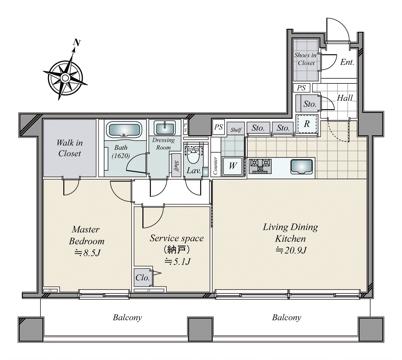 是有收纳的多功能室。地板是为壁橱被用成熟稳重的木纹风格设立衣服以及行李的清理容易做的印象。壁面大,并且床或者桌子等的家具配置也有灵活性。
