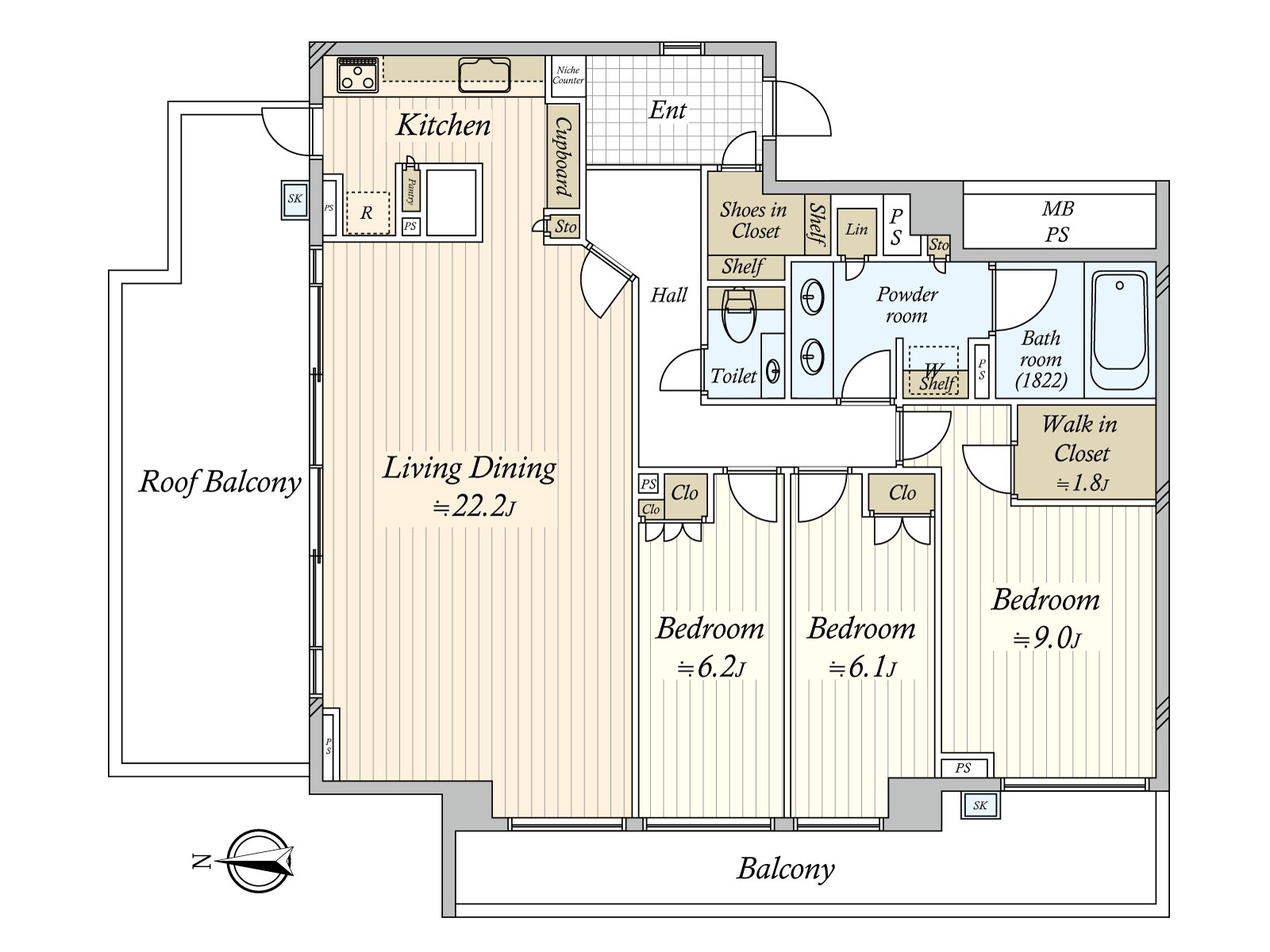* 1.8 quires of walk-in closet etc., storing are abundant