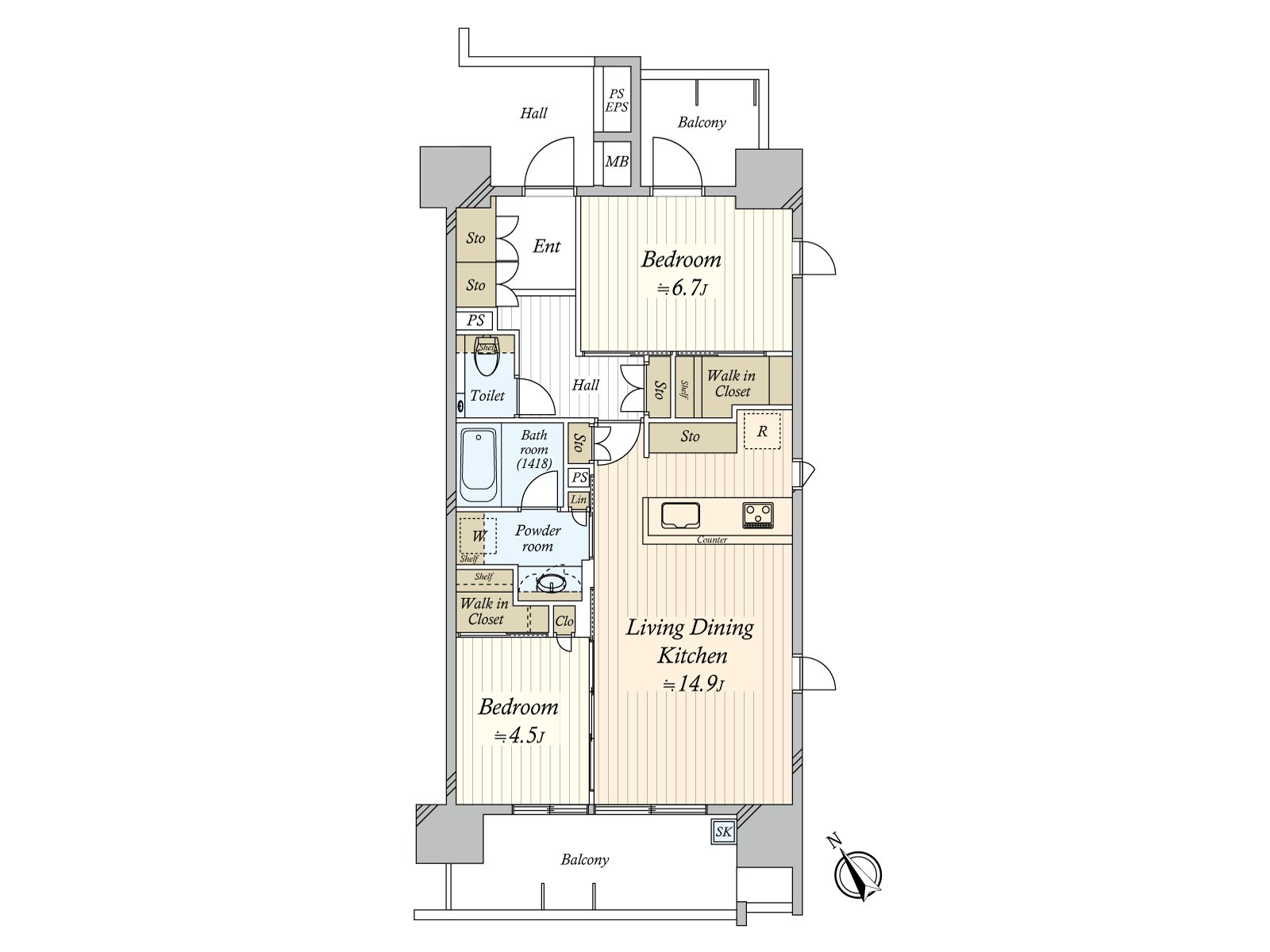* 2LDK of 64.38 square meters of exclusive area