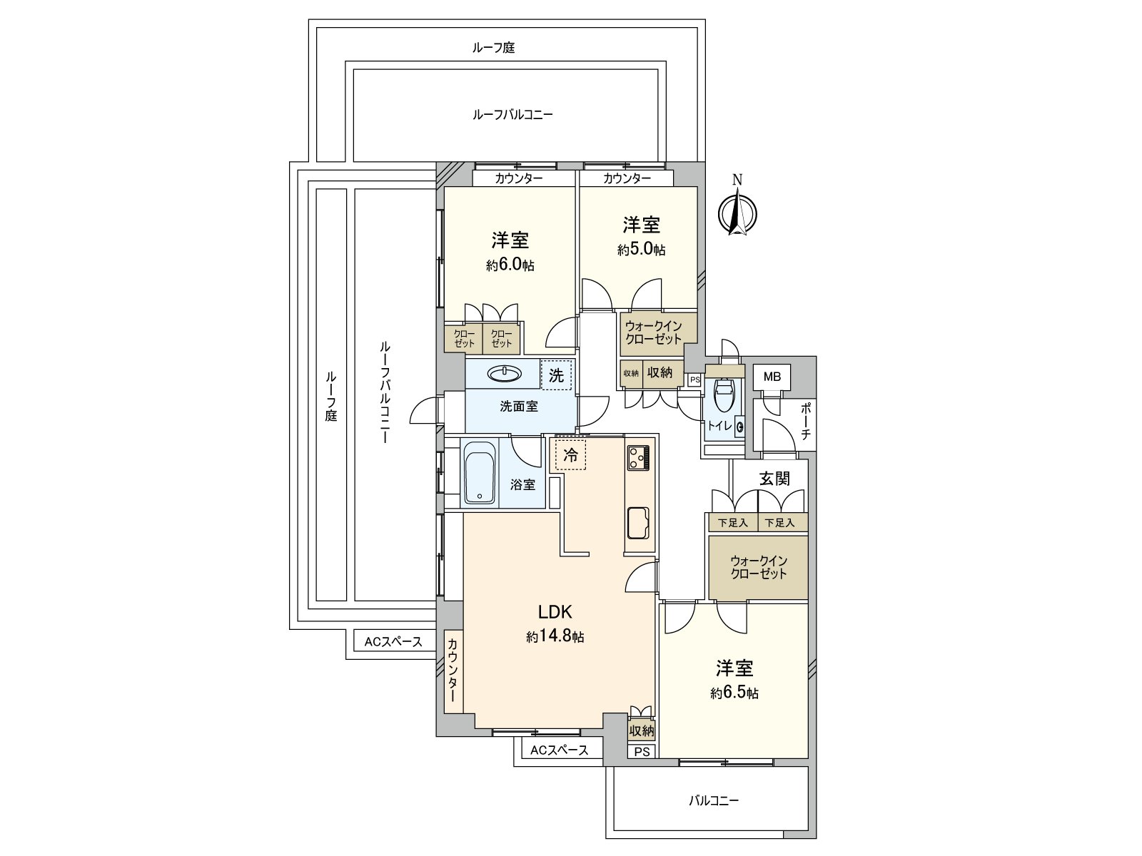 〇洋室(約5.0帖、約6.5帖)にはそれぞれWICがあり、そのほか各居室に収納スペース付き