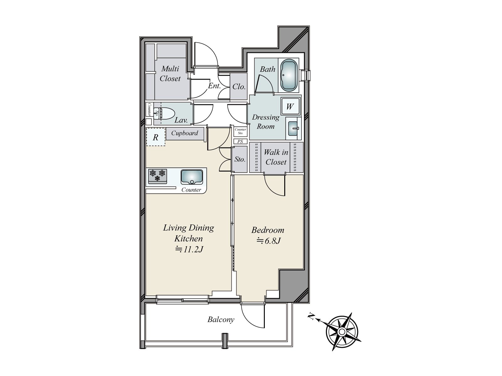 ・キッチンカウンターとカップボード完備