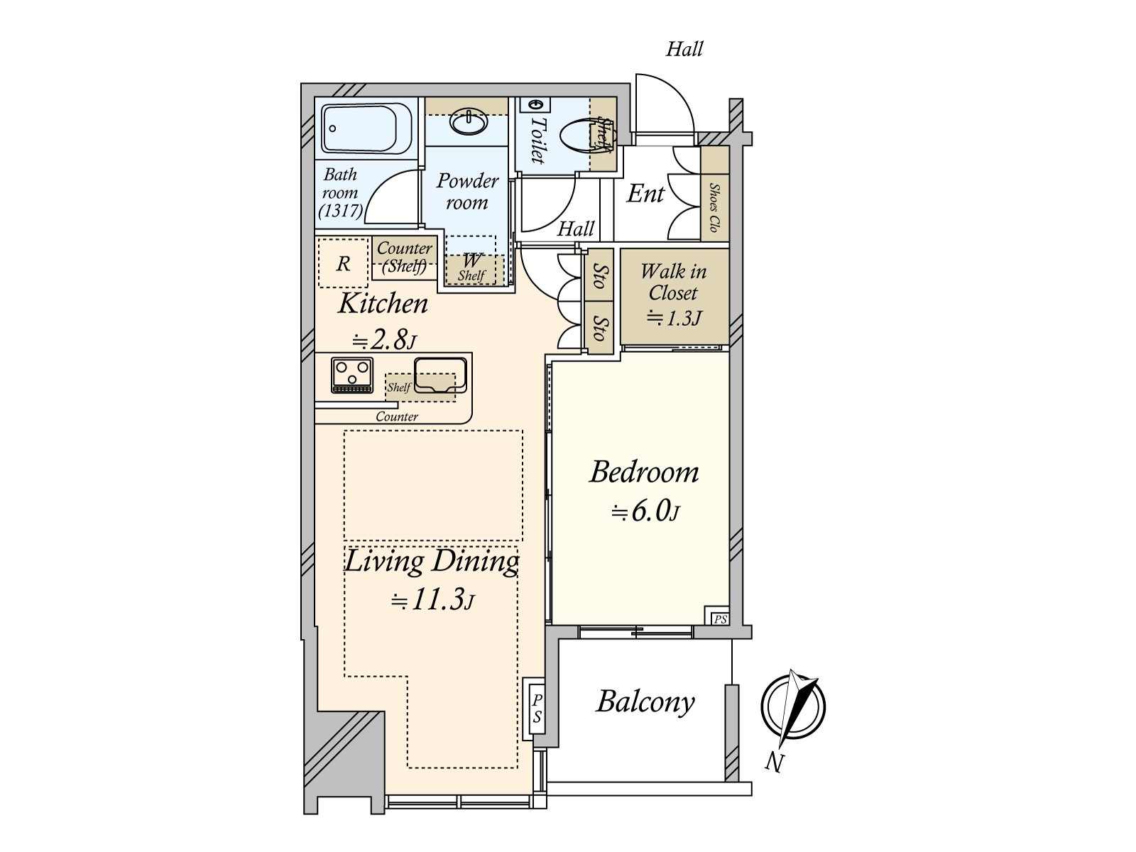 ○15階部分、専有面積46.64平米1LDKの間取り