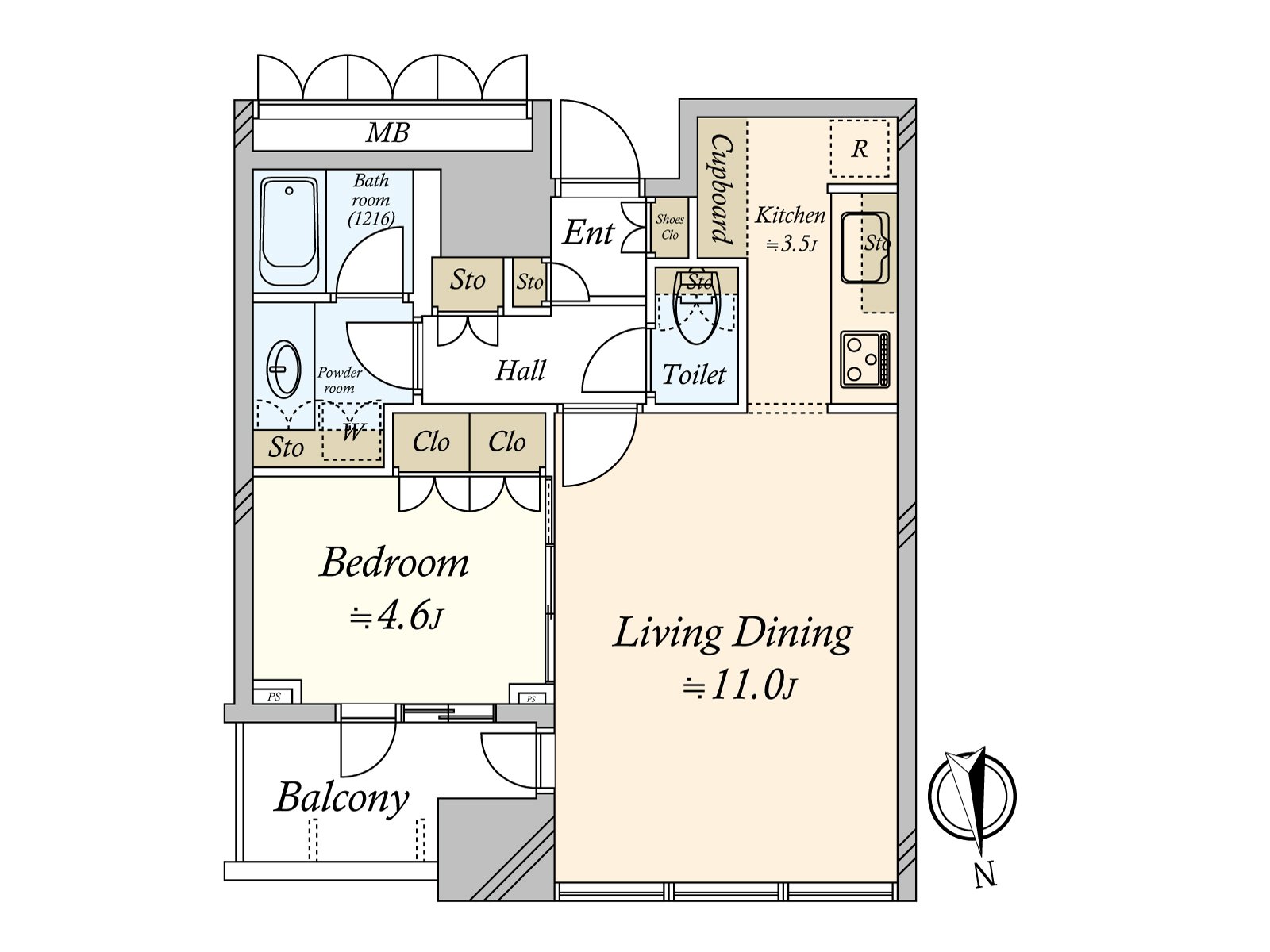 〇 専有面積44.54平米、1LDKの間取り