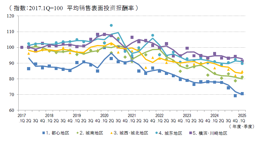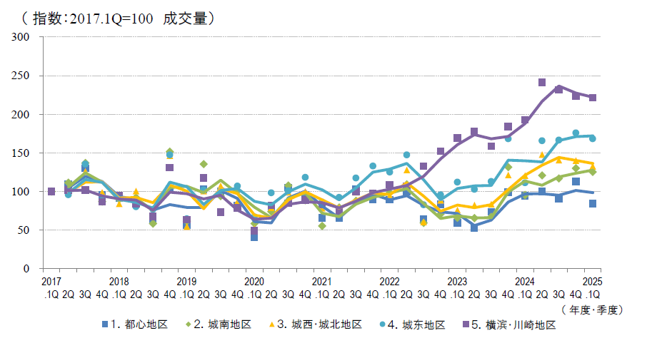 横滨和川崎区域2025.1 Q的收益率指数成交和销售均下降(价格上升),创下2017年开始统计以来的最低水平。此外,尽管成交件数自2024年第2季度达到历史最高水平以来已连续第三个季度小幅下降,但仍有大量交易,市场蓬勃发展。
