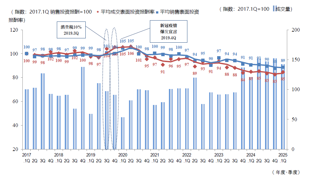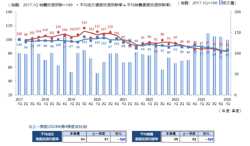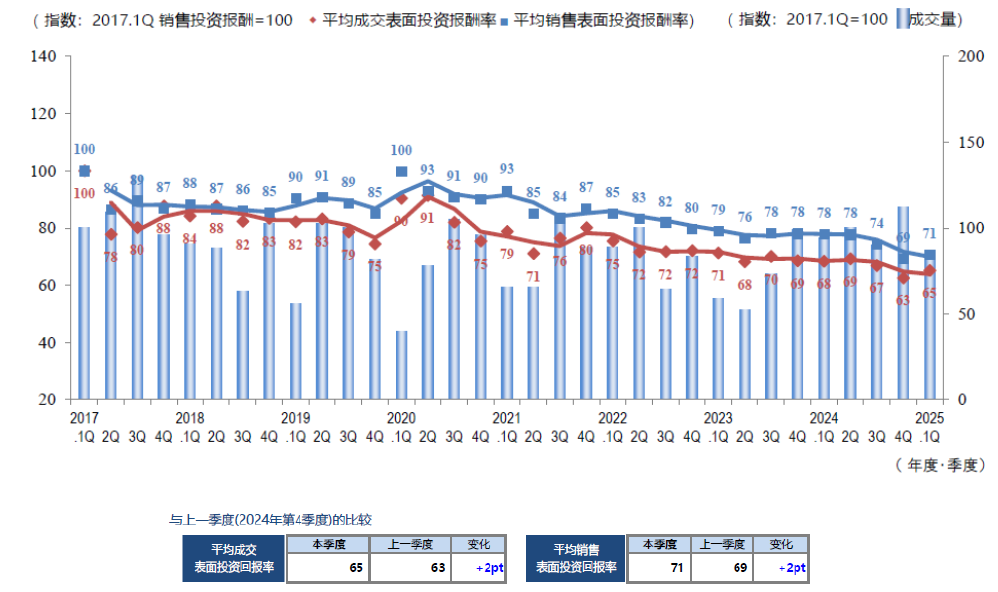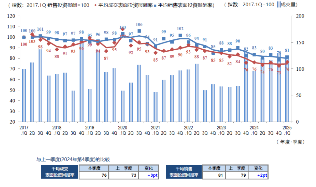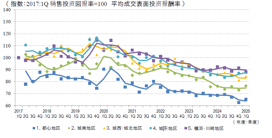 城南2025.1 Q的平均出售表面回报率指数为81(较上一季度+3pt),平均成交表面回报率指数为76(较上一季度+3pt)。虽然都是较上一季度有所上升,但从最近一年的推移来看,收益率总体有持平的倾向。