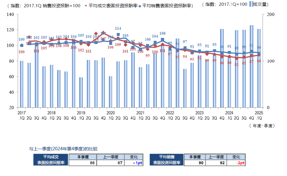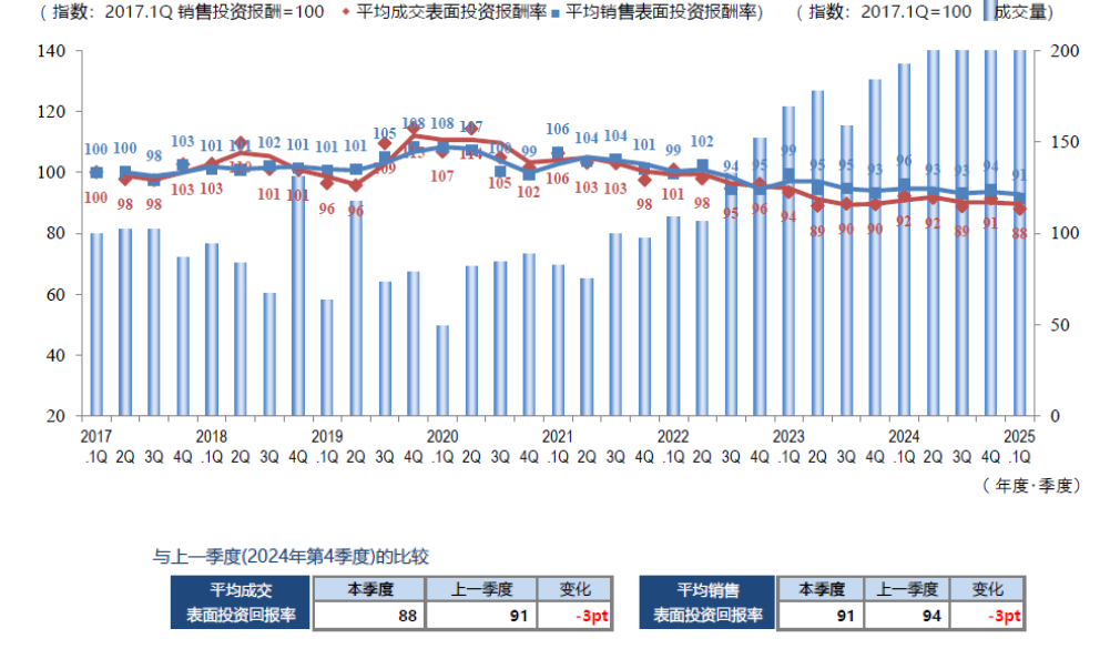 城东区域2025.1 Q的平均成交表面回报率指数为88,较上一季度+1,虽然缓慢,但2024.2 Q以后的上升趋势(=价格下跌趋势)仍在继续。
