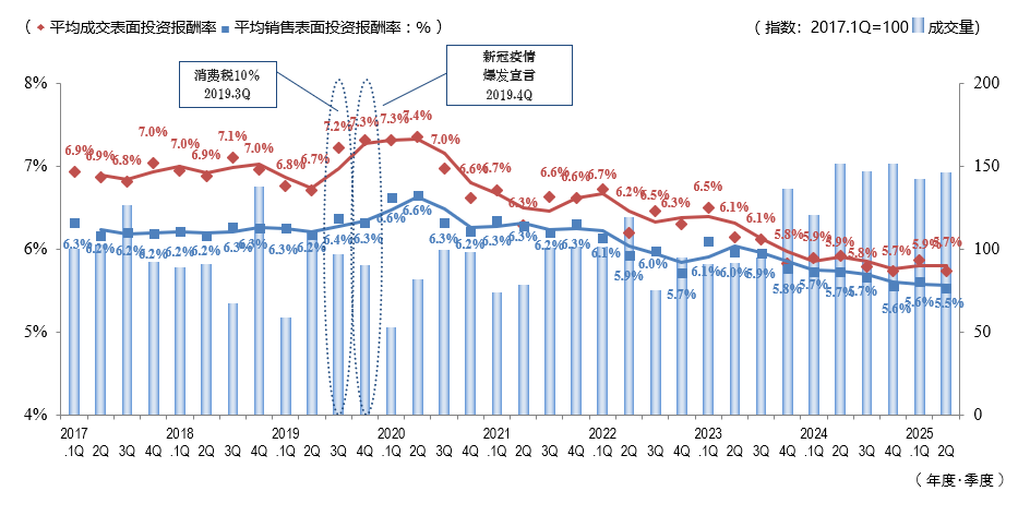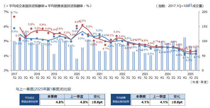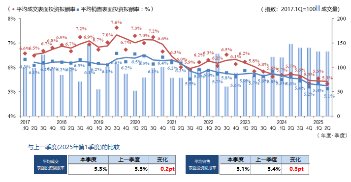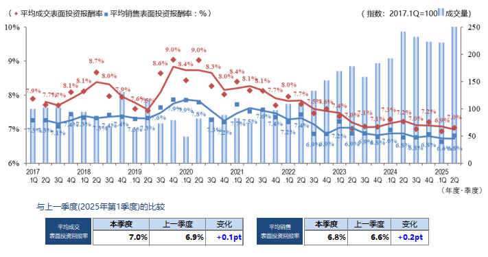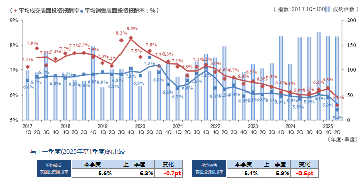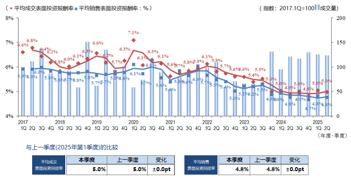 都心区域2025.2Q的平均出售表面回报率和平均成交表面回报率均为上一季度比±0.0 pt,持平,但成交件数方面,继第1季度之后,与去年同期相比有所减少。