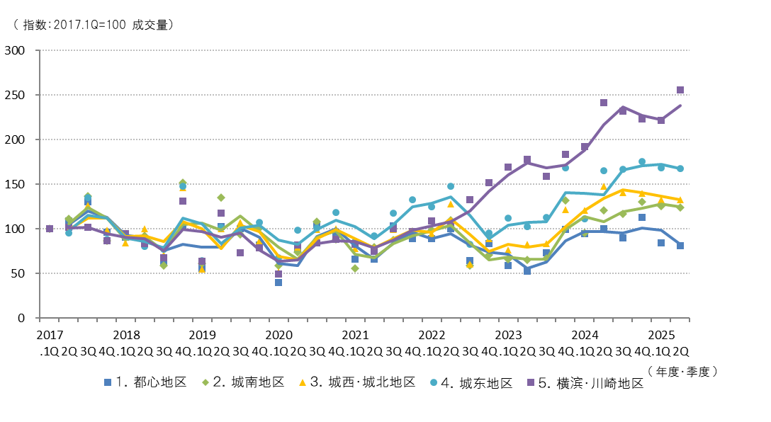在横滨・川崎区域,2025 年第二季度的平均回报率(无论成交或挂牌)均小幅上升(价格下跌)。自 2024 年第一季度以来呈下降趋势的走势,本期出现了反转。另外,成交件数超过了历史最高水平的2024.2 Q,成为2017年开始统计以来的最高值。虽然价格上涨的势头略显放缓,市场整体依然保持旺盛态势。