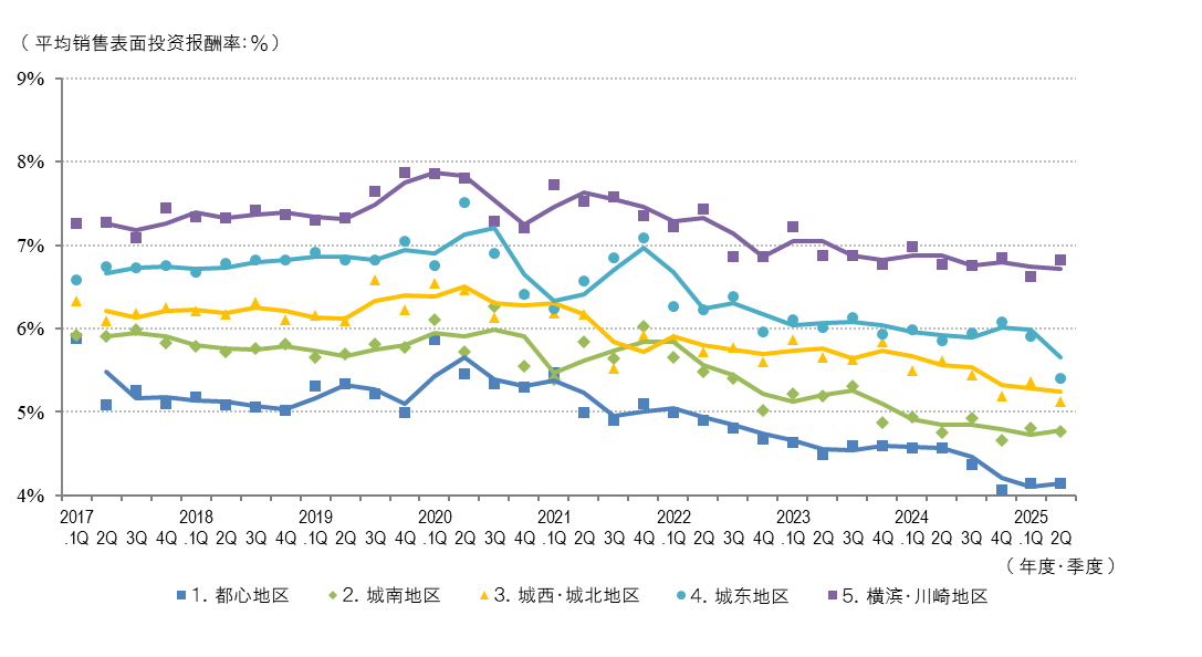 2025.2季度,东京都各区域投资性房地产市场的平均成交表面回报率趋于持平或下降,而横滨和川崎区域则转为小幅增长。虽然在部分区域出现调整,市中心的成交件数较上年同期有所减少、城南地区较上期有所下降,但整体仍维持在高水准,市场的活跃态势依旧持续。