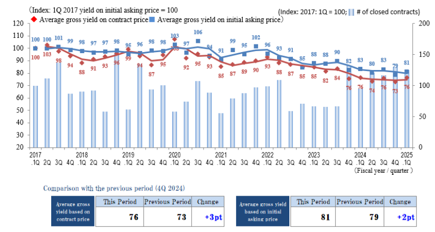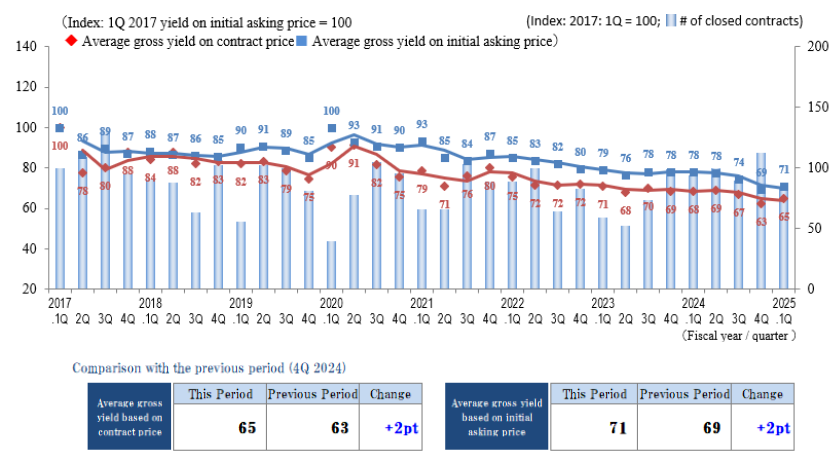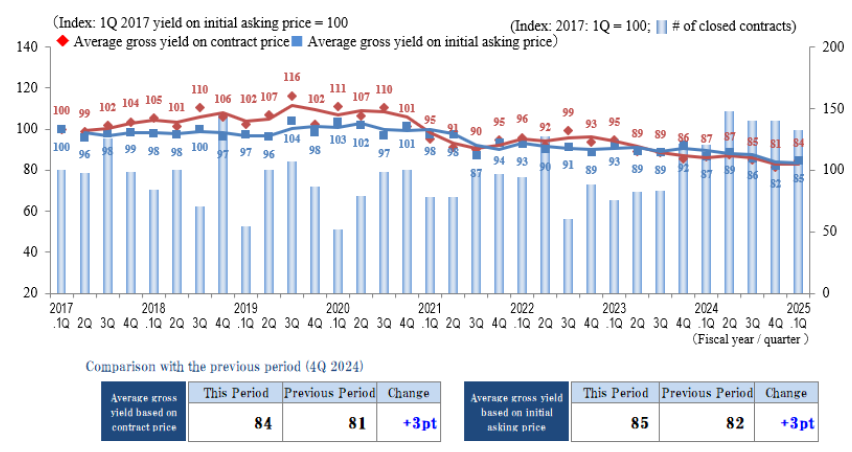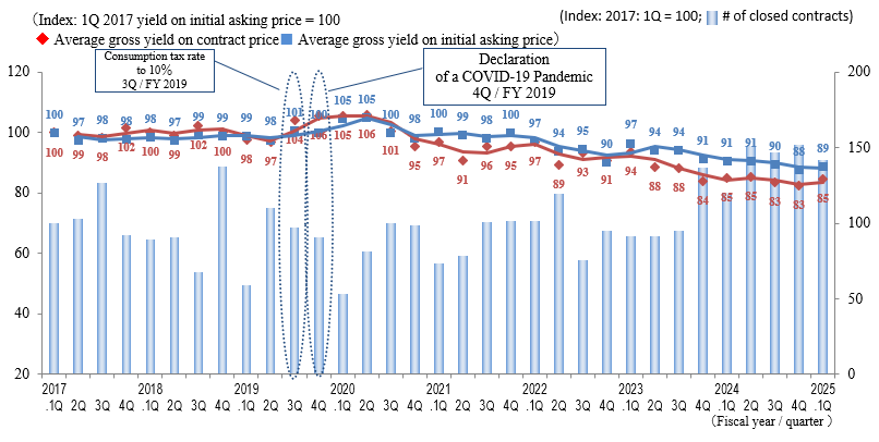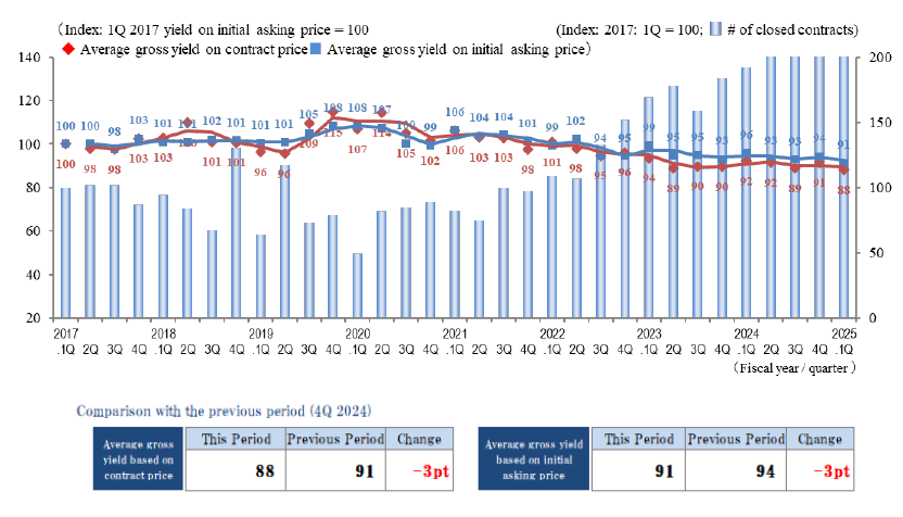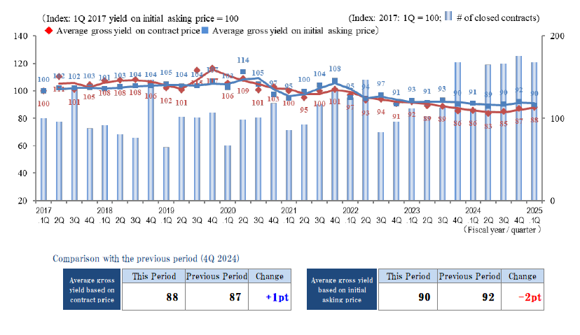 The indices of the average gross yield on the contract price and the initial asking price both fell (prices rose) in the Yokohama / Kawasaki region in 1Q / FY 2025 to reach new record low levels since data collection began in 2017. The number of contracts made in the region decreased only slightly for the third consecutive quarter since 2Q / FY 2024 since the number of transactions remains high and lively market conditions can be said to continue.