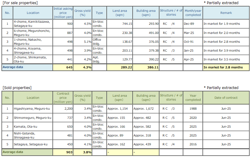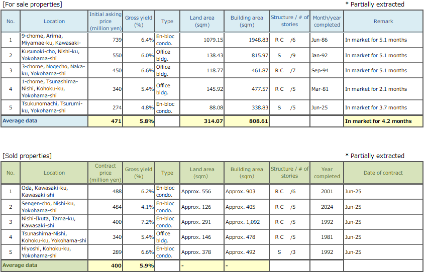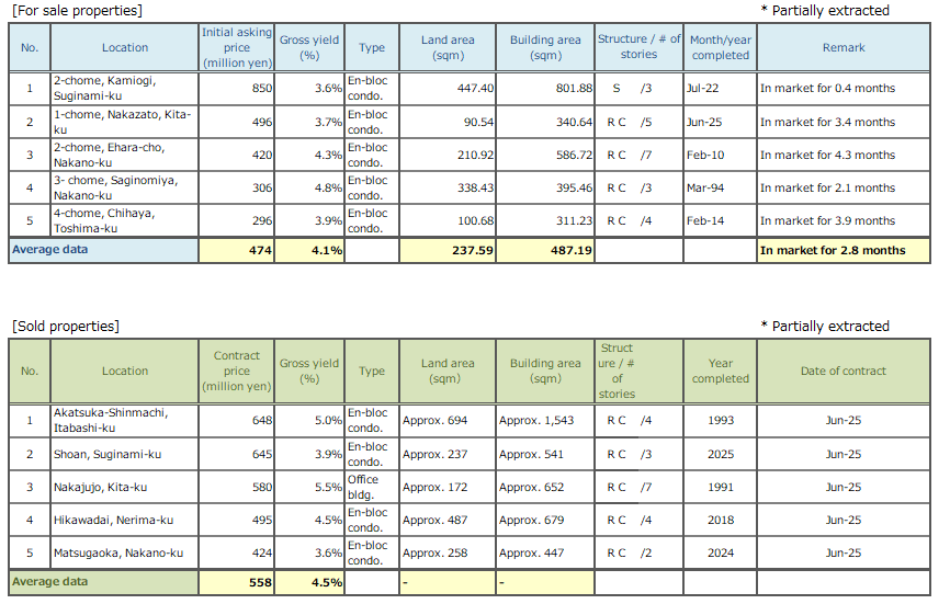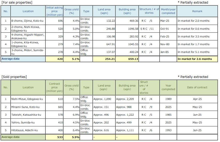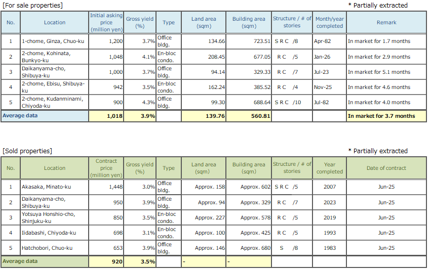 The favorable conditions in the leasing market are having a positive effect on the investment real estate market. At the same time, there are growing concerns about the possible impact of continued rising interest rates as was experienced through the previous quarter, as well as realization of political uncertainty due to the second Trump administration and the results of the House of Councilors elections.