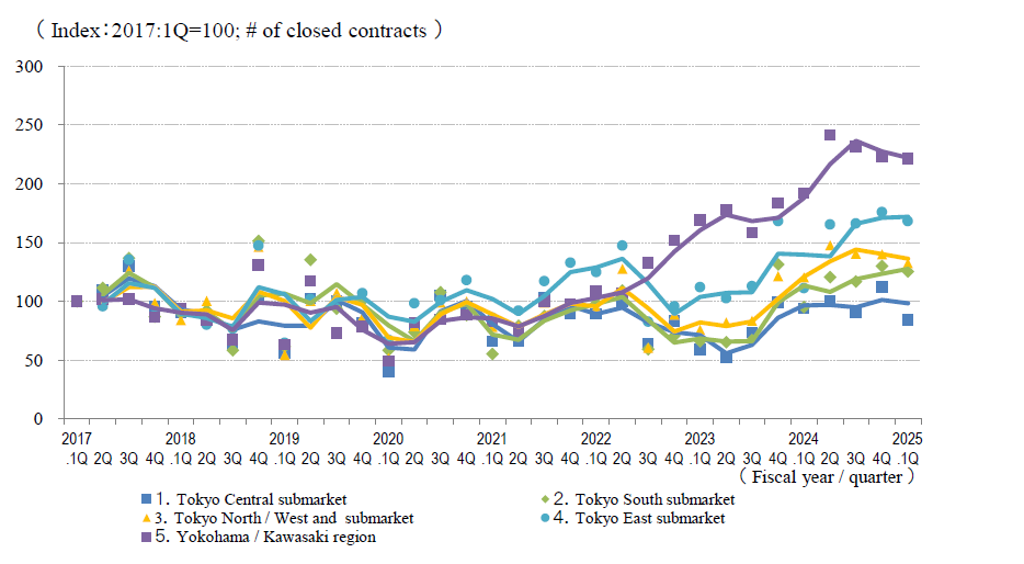 The indices increased for the average gross yield on the initial asking price and on the contract price both showed a gentle increasing trend, rising by 2 pt, although the number of contracts was down slightly QoQ in the Tokyo central submarket in 1Q / FY 2025. The leasing market in the Tokyo central submarket is reviewed below: