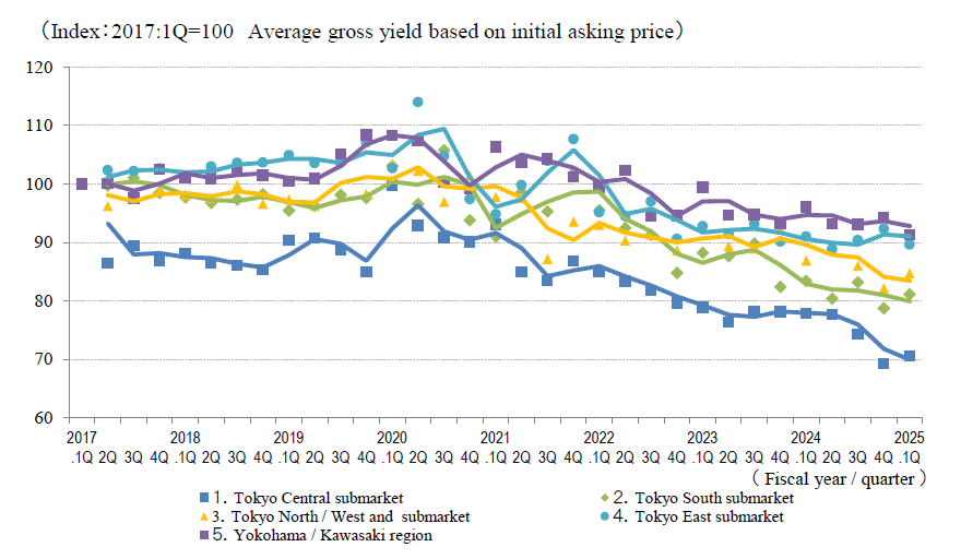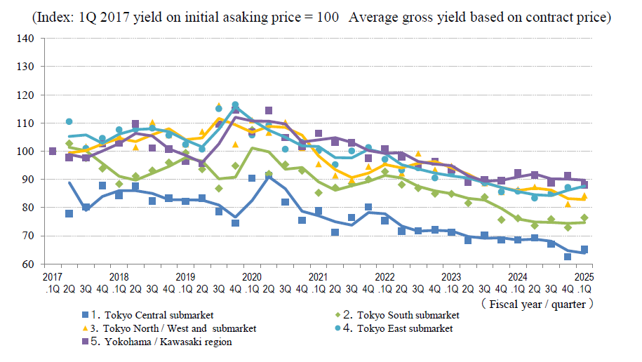 The Indices of the average gross yield on the initial asking price and the contract price in the Tokyo south submarket both increased by 3 pt QoQ in 1Q / FY 2025 to 81 and 76, respectively. While each of these is trending up QoQ, the yield trend over the most recent year can be said to be largely flat.