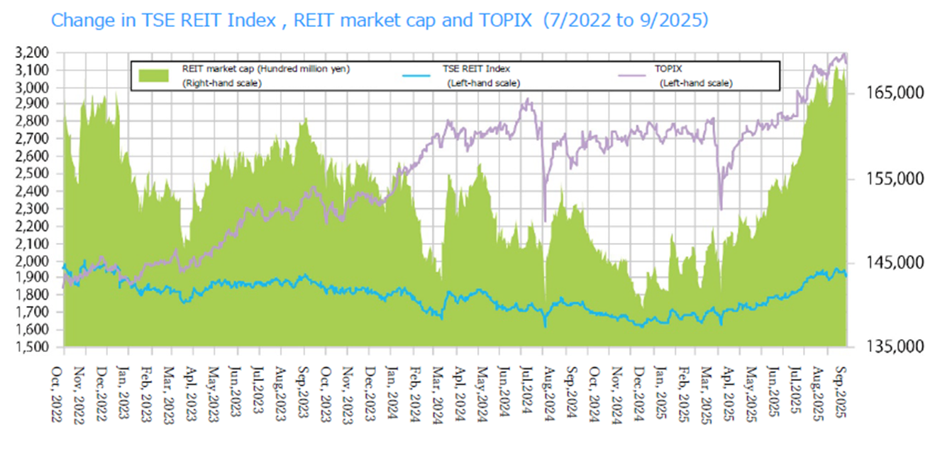 ・At the end of September 2025, the TSE REIT index was 1,921.07, up 8.0% from June, and market capitalization of all J-REITs was JPY 16.5907 trillion, up 8.2% from June. Factors behind the recovery in investment unit market prices since the start of 2025 include increased returns to investors because REITs have switched to investment with a focus on capital efficiency, further strengthening of the upward trends in office and residential rents, a sharp increase in variable rents on hotels backed by growing inbound demand, and continued growth in dividends.