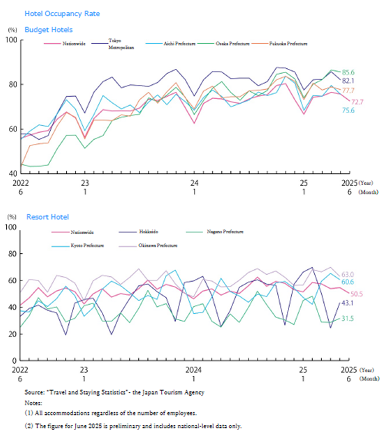 ・Guestroom utilization rates (at facilities with 10 or more employees) in July 2025 were 49.9% for Japanese-style inns, 58.3% for resort hotels, 76.6% for limited-service hotels, and 71.6% for full-service hotels. Rates were highest for limited-service hotels and full-service hotels. The guestroom utilization rate for limited-service hotels exceeded 80% in eight districts: Hokkaido and Aomori, Akita, Nagano, Osaka, Hyogo, Saga, and Okinawa Prefectures, while the rate was 79.7% in Tokyo and 73.3% in Kyoto Prefecture.