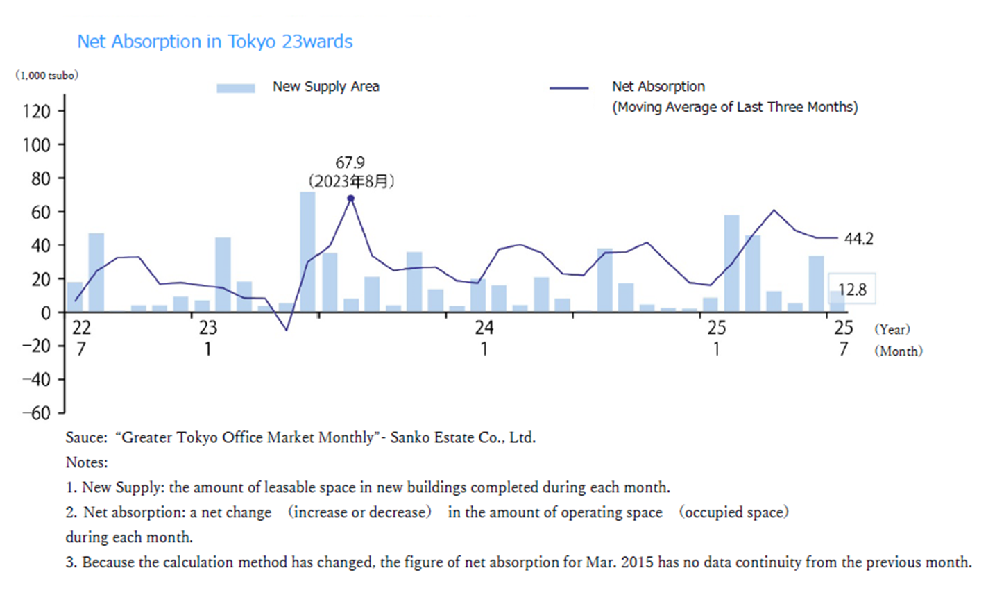 ・Net absorption (change in office occupied floor space) was +39,263 tsubo in August 2025 and a cumulative +371,262 tsubo since January 2025. This cumulative net absorption is up 128,030 tsubo compared to the same period last year.