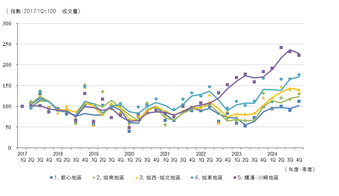 橫濱和川崎區域2024.4 Q的成交件數在最近兩個季度幾乎持平,但超過了去年同期的數量,繼第2季度之後創下了自2017年開始統計以來的最高平均。儘管相較於東京都內價格漲幅較小,成交量仍呈穩健增長態勢,市場持續表現活躍。