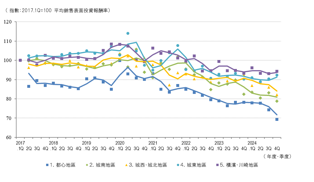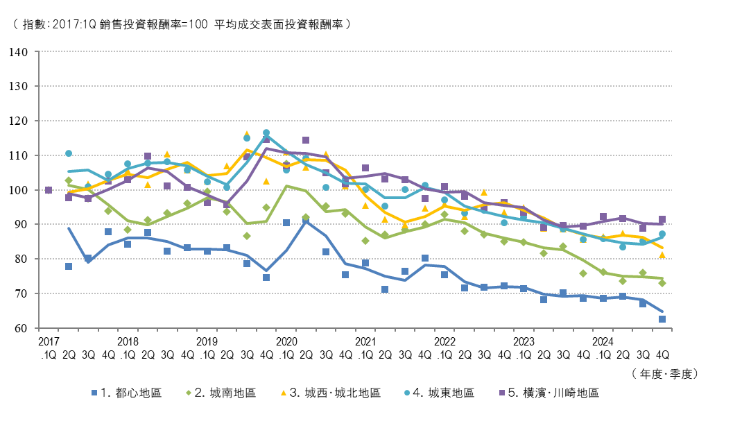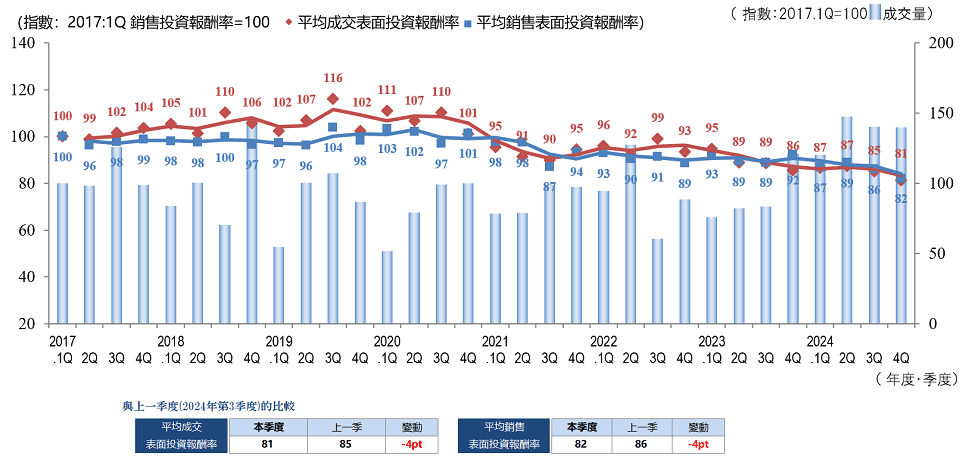 2024.4 Q城東區域的平均成交表面投報率指數為85,平均出售表面投報率指數為92,2024.2 Q以後的上升趨勢(價格下跌趨勢)仍在繼續。另一方面,成交件數與去年同期一樣非常多,是2017年開始統計以來的最多數量,可以確認交易活躍。