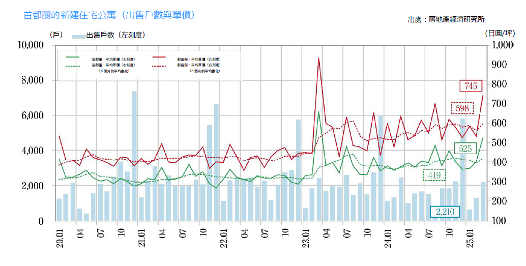 ・2025年5月供應戶數為1,064套,平均出售價格、面積、單價為5,813萬日元、58.57㎡、327.5萬日元/坪,月末庫存數為2,621套,首月簽約率為74.7%,上個月對比-2.3 pt,去年同月+6.0 pt。連續5個月超過70%,漲勢良好。