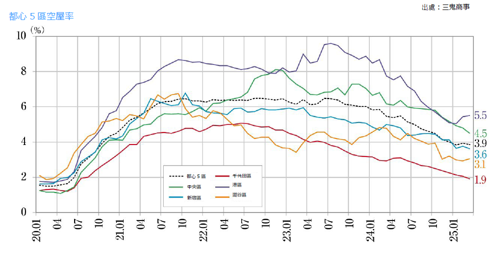 ・東京都心5區空置率全部跟上個月比下跌,千代田區、澀谷區空置率低於3%。所有區的租金跟上個月比也上漲。