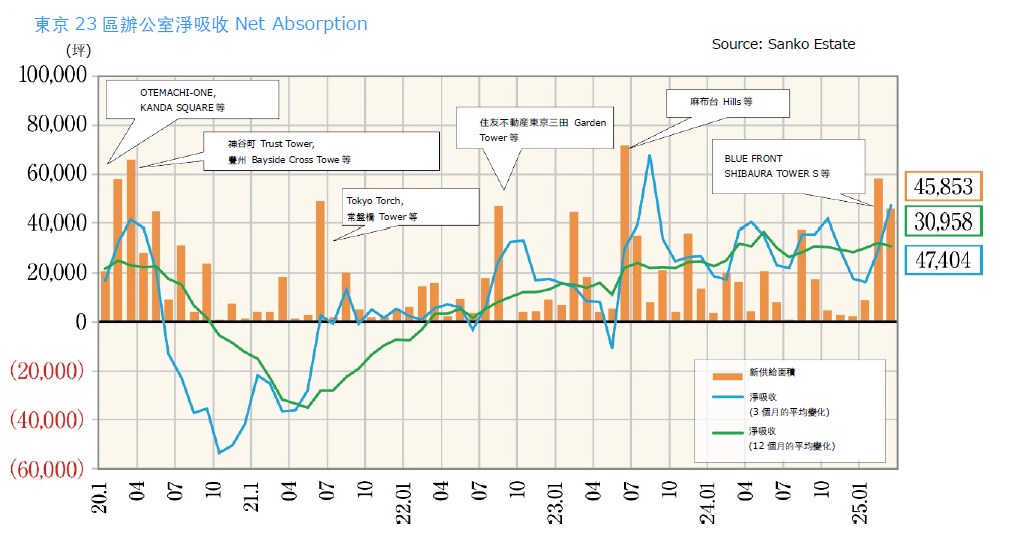 ・東京23區5月單月凈吸納量(辦公面積增減值)為+24,140坪,去年同月+5,477坪。