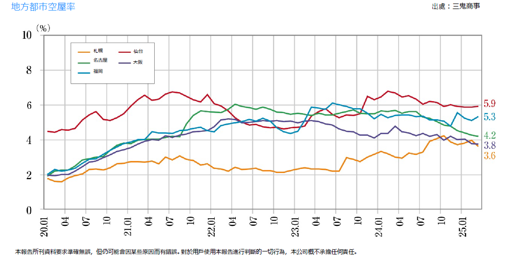 ・仙台:5.91%·年比+0.04 pt,9,437日圓/坪·年比+14日圓(空置率基本持平,平均租金上升)