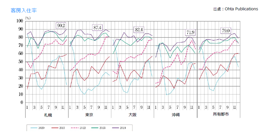 ・2025年4月整體客房入住率為61.7%(去年同月增長1.9%),按設施類型劃分,度假酒店客房入住率為57.4%,商務酒店為74.8%,綜合酒店為74.0%。大阪的客房入住率也受到世博會的影響,達到78.0%,是全國最高值。
