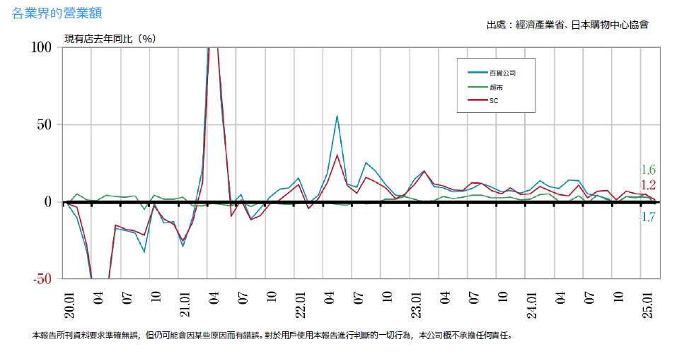 ・2025年4月,現有商業設施銷售額(整體)約為6,298億日元(去年同月增長2.3%),連續38個月正增長,儘管春夏服裝因上半月的低溫而陷入苦戰,但雜貨和餐飲等其他行業支撐了銷售額,超過了去年。