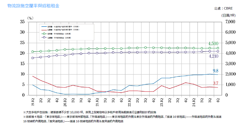 ・2025年第2季度~2026年第1第1季度的新供給預定為首都圈約43萬坪,近畿圈約34萬坪,中部圈不到24萬坪,福岡圈約7萬坪。
