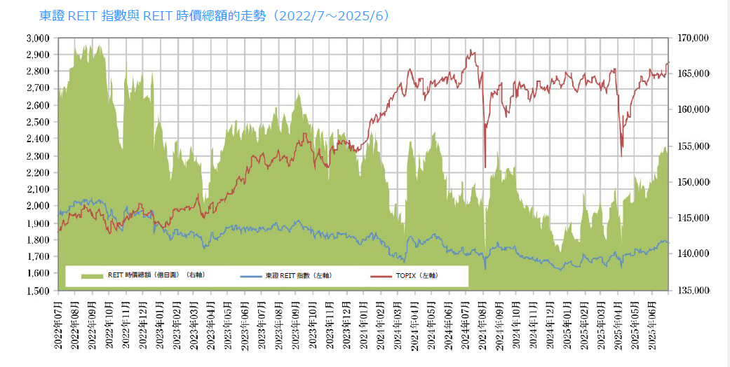 ・2025年6月末,東證REIT指數為1,778.87點,較2024年末上漲+7.62%,REIT整體市值為15.3279億日元,前年同月上漲+7.23%,遠高於同期TOPIX漲幅+2.44%。由於對美國川普政府關稅政策的擔憂,4月初股市暴跌,東證REIT指數也創下了年初以來的新低,但很快恢復到1,700點左右,此後總體呈緩慢回升態勢。