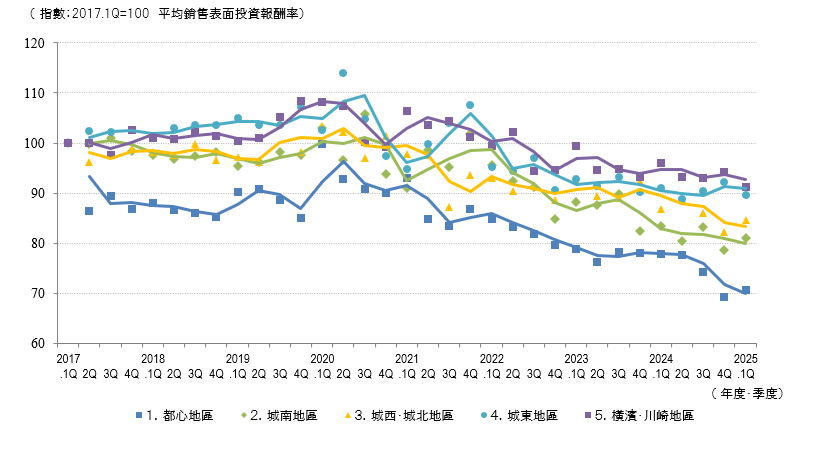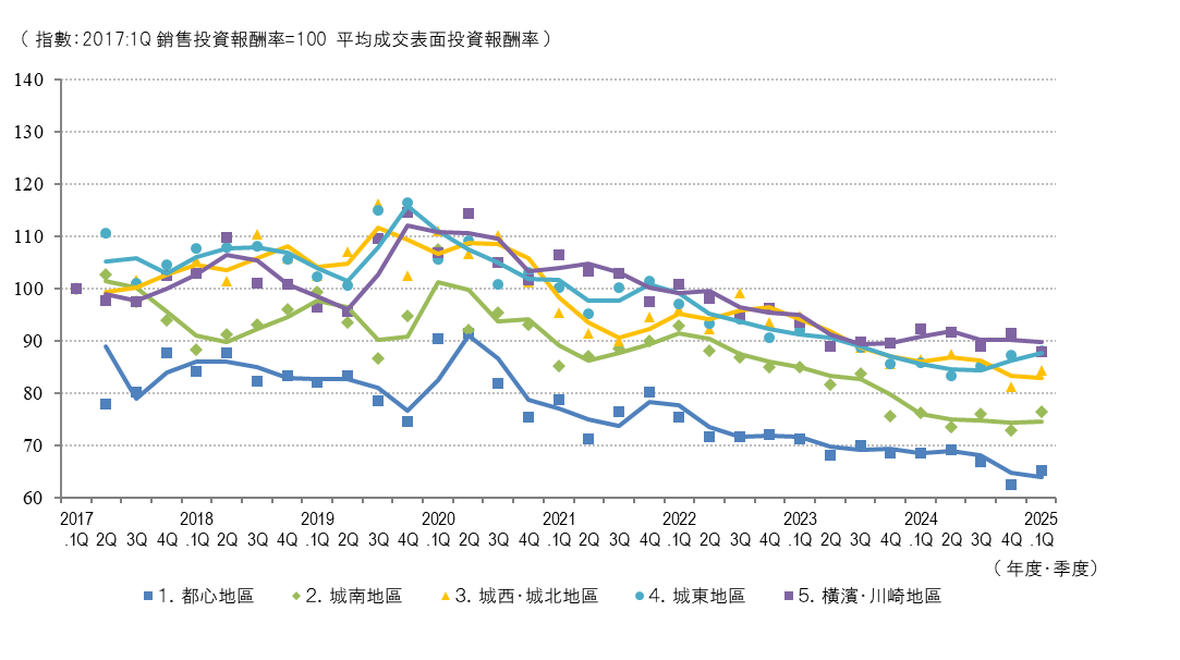 2025.1季度的平均成交表面回報率為,除橫濱和川崎區域以外的所有區域的上一季度為正,區域合計為+2pt。雖然各區域的平均銷售表面回報率變化有所不同,但整體上上一季度度比+2pt。