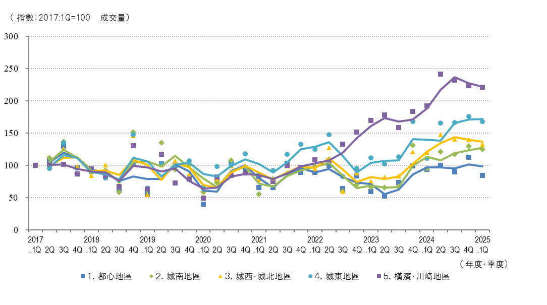 橫濱和川崎區域2025.1季度的收益率指數成交和銷售均下降(價格上升),創2017年開始統計以來的最低水平。此外,成交數量自2024年第二季度達到歷史最高水平以來,已連續第三個季度小幅下降,但仍有大量交易,市場蓬勃發展。