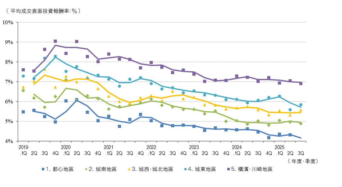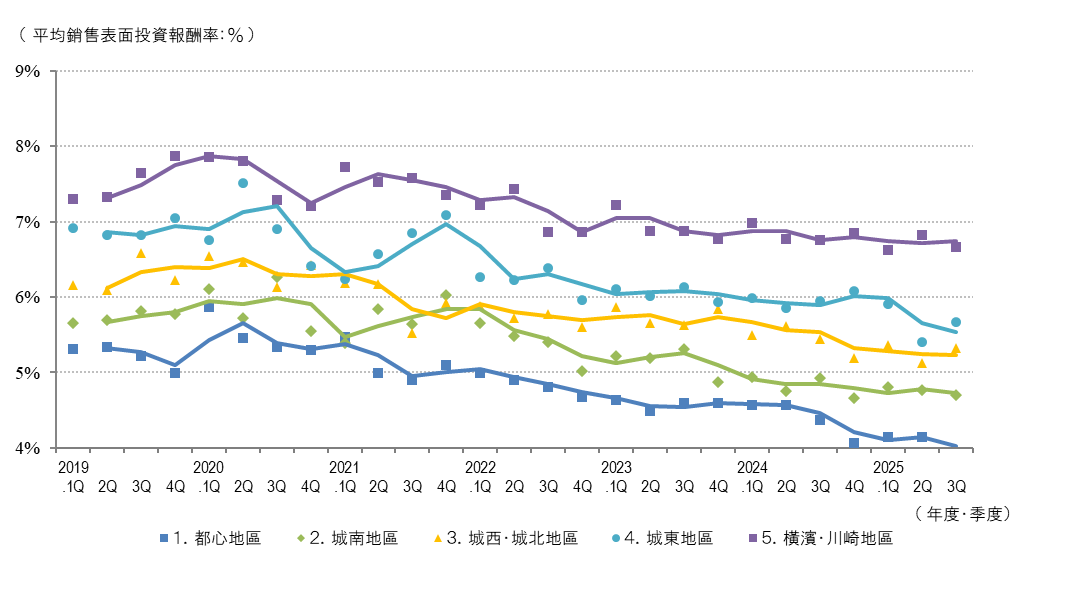 都心區域2025.3 Q的平均出售表面回報率和平均成交表面回報率均為上一季度比-0.2 pt和-0.3 pt(價格上漲),成交件數方面,與去年同期相比有所增加。然而需要注意的是,本季度成交表面回報率的下降並非單純基於回報率壓縮所致,其中包含多件期待未來租客搬遷後進行都市更新的低回報率成交案例。因此有必要持續密切關注後續走勢及市場結構變化。
