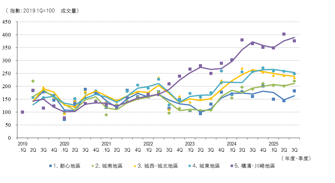 2025.3 Q,橫濱及川崎區域平均回報率(成交及掛牌)均小幅下降(對應價格上漲)。從2020年以來持續下行的回報率在最近一年至兩年基本維持持平,市場整體表現相對穩定。成交件數雖與創下2017年統計以來最高值的上一季度比有所回落,但本季度仍處於高水準,顯示市場活躍度持續。