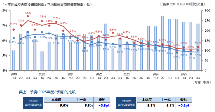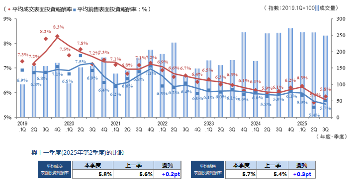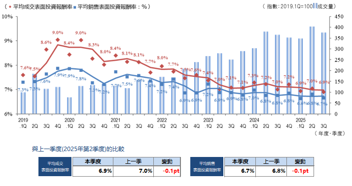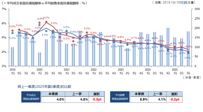 上一季度,屋齡淺物件價格上漲壓低了整體回報率; 而本季度則因投資者回報率導向增強,以及伴隨價格調整的交易增加,對指標產生影響。