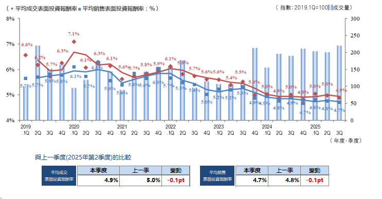 2025年城南第3季度的平均出售表面回報率為4.8%,平均成交表面回報率為4.9%,上一季度比-0.1 pt。從最近一年的變化來看,回報率大致持平。