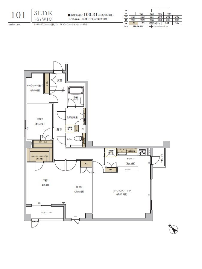 ○ 私人使用面積100.81平方公尺,3LDK+S+WIC,多功能室能不僅收納而且用於工作區多目的